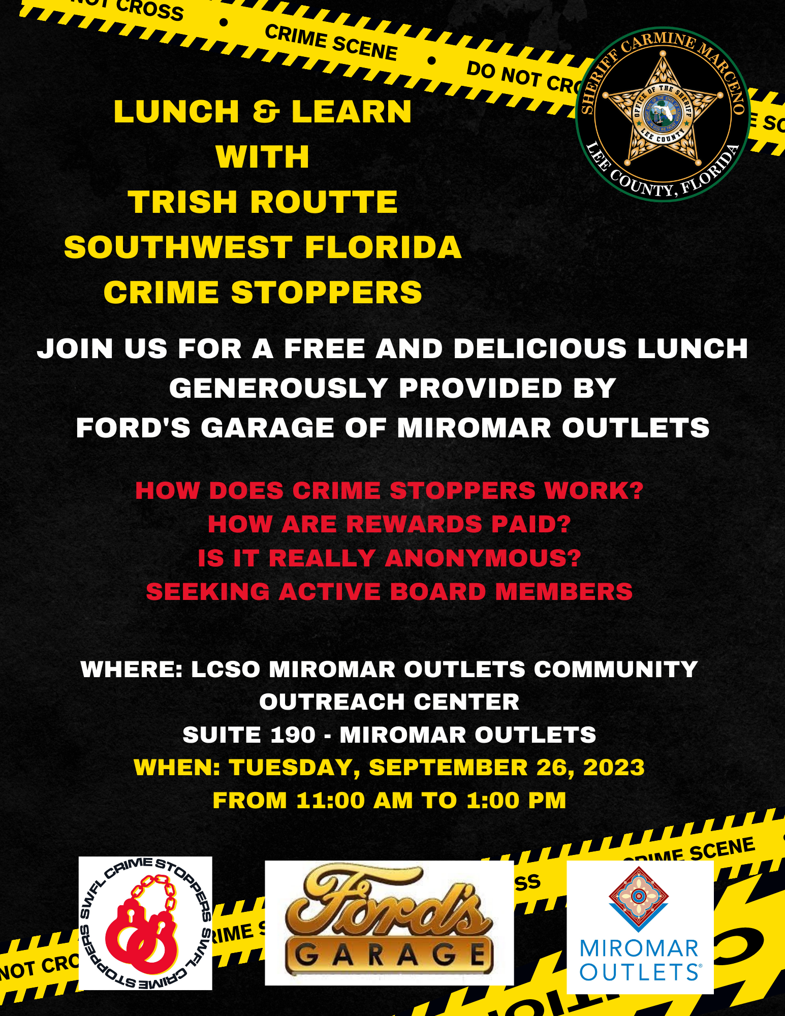 Trish Routte, Southwest Florida Crime Stoppers Director, will be speaking regarding the importance of the Crime Stoppers program, the mechanisms that keep ALL calls confidential, program successes and the reward process.