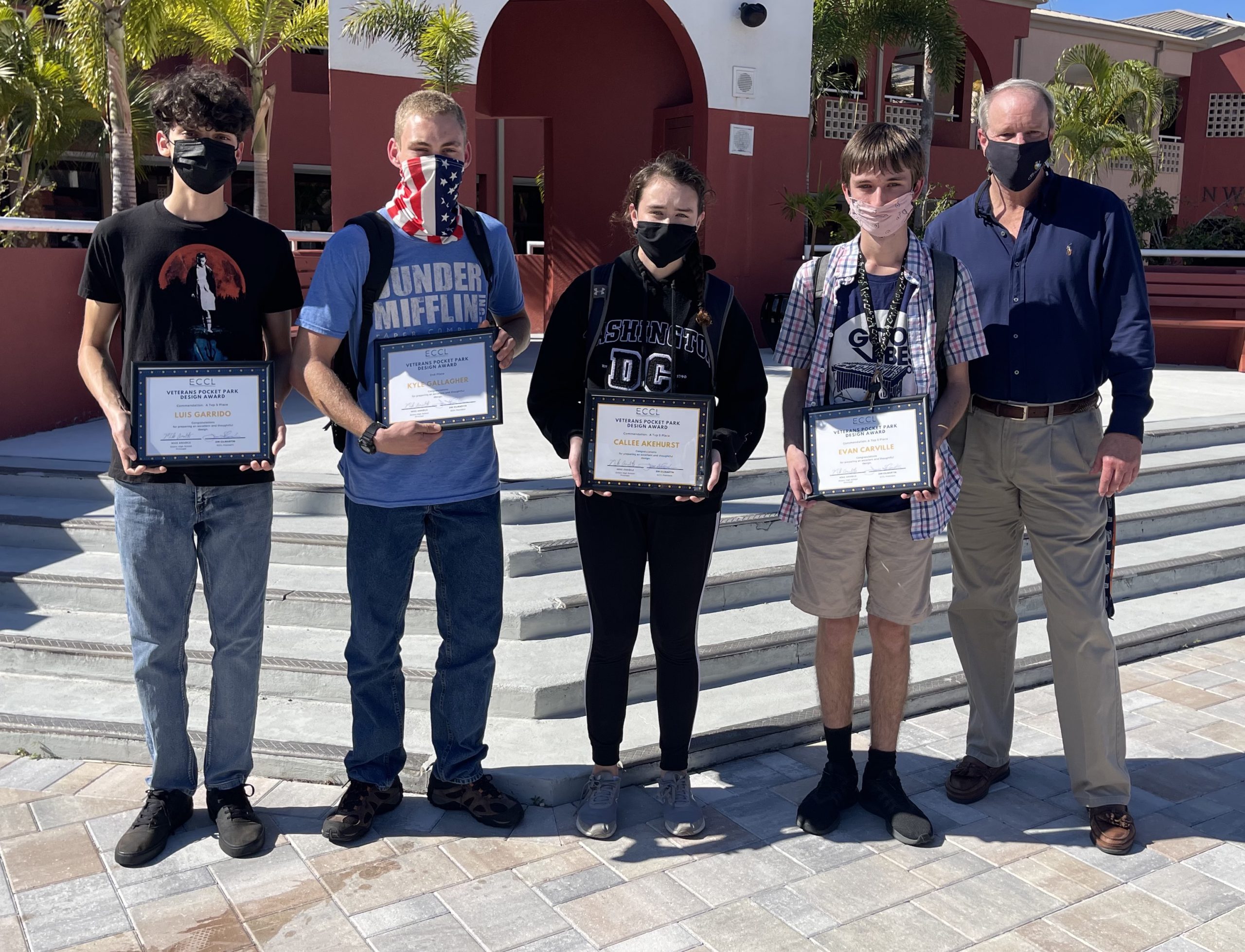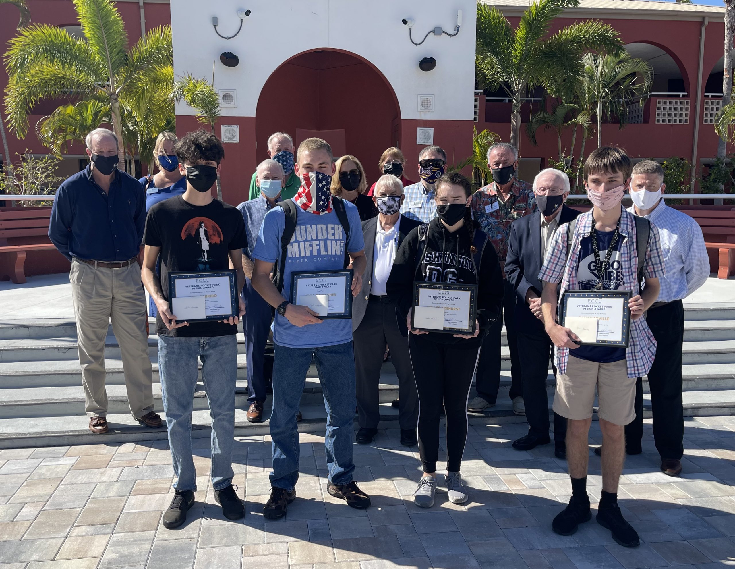 Behind them Left to Right: Norm Heyboer, Estero High School Digital Design Instructor; Sally Ricciardelli, ECCL Board Member; Allan Bowditch, ECCL Chief Communications Officer, Jim Shields, ECCL Board Member; Chris Patricca, Lee County School Board; John Quin, ECCL Chief Financial Officer; Judy Hammond, ECCL Co-ordinator of Project; Mark Novitski, ECCL Chief Operating Officer; Barry Freedman, ECCL Chief Membership Dev. Officer; Jim Gilmartin, ECCL President; Chris Simoneau, ECCL Board Member.